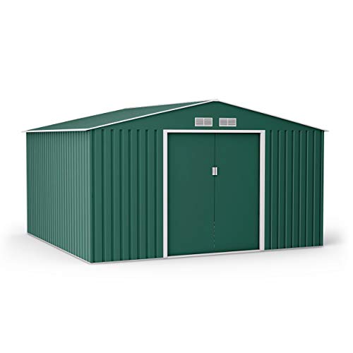 BillyOh Ranger Apex 11x10 Shed, Dark Green - Galvanised Steel Garden Storage Box for Tools & Bike with Vents, Foundation Kit - Lockable 2 Door Metal Shed for Outdoor Storage Cabinet Solution
