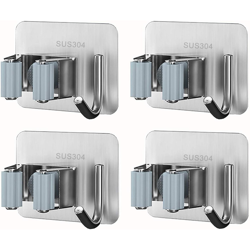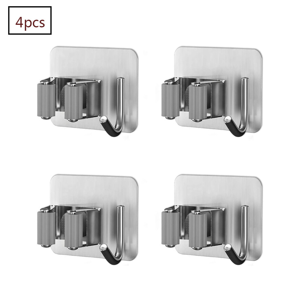 4 Pcs Wall Mounted Broom Holder, SUS304 Self Adhesive Stainless Steel Wall Mounted Brooms with Hooks, Mop Holder for Bathroom Kitchen Garden Balcony O