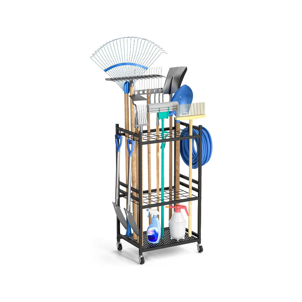 (With Wheels -3 Hooks Included)Steel Garden Tool Organizer for Garage Organization and Storage Up to 35 Long-Handled Tools/Rakes/Brooms