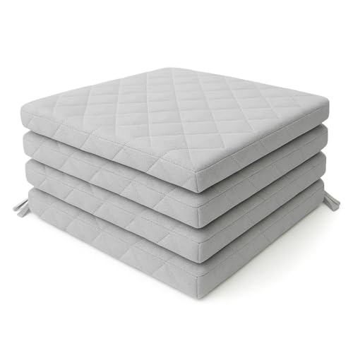 4Pcs Quilted Dining Garden Chair Seat Pads with Ties for Kitchen, Living Room, Patio, Office – Indoor Outdoor Foam Cushions with Removable Covers (Grey)