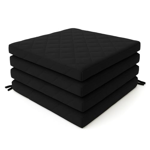 4Pcs Quilted Dining Garden Chair Seat Pads with Ties for Kitchen, Living Room, Patio, Office – Indoor Outdoor Foam Cushions with Removable Covers (Black)