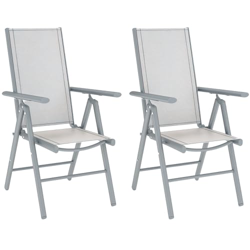 Outsunny Set of 2 Folding Garden Chairs, Aluminium Frame Outdoor Dining Chairs with Breathable Mesh Back and Seat, Garden Folding Chair Set with Armrests for Balcony, Light Grey