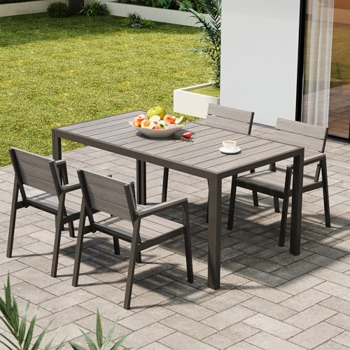 Devoko HDPS 5-Piece Outdoor Garden Furniture Set, Weather-Resistant 150 cm Table and 4 Outdoor Garden Chairs, Aluminium, Wood Grain Finish and Easy to Maintain (Grey)