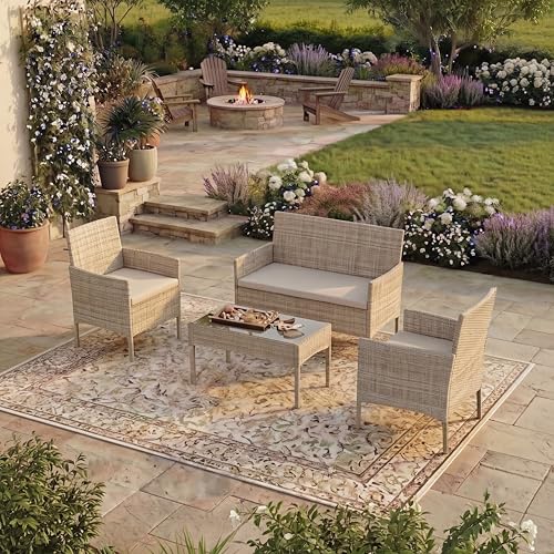 Garden Vida Kendal 4 Piece Rattan Seating Set | Natural | Outdoor Garden Patio Furniture Set | Steel Frame & PE Wicker Construction | UKFR Certified | Weather Resistant Garden Chairs with Cushions