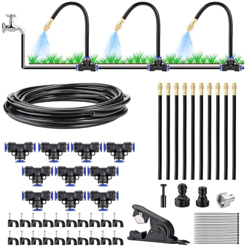 Automatic Drip Irrigation Kit 33FT - DIY Garden Watering System with 10Pcs 360° Adjustable Bendable Brass Mist Nozzles, Faucet Adapter, Hose & Cutters for Greenhouse Yard Cooling Humidifying
