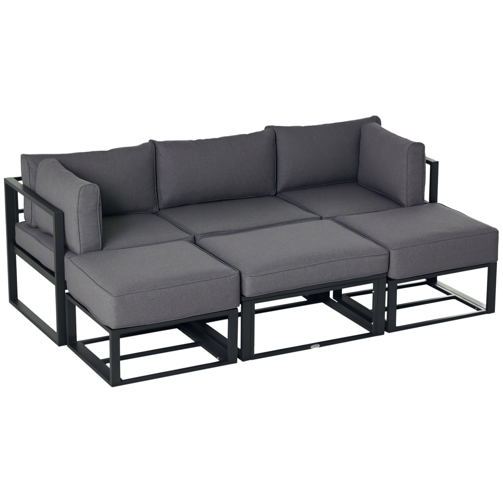 Outsunny Garden Daybed, 6-Piece Aluminium Outdoor Sectional Sofa Set with Cushions, Patio Conversation Furniture Set with Coffee Table and Footstool, Grey