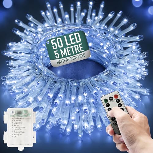 GloBrite Garden Fairy Lights Battery Operated - 50 LED String Lights with Remote - 8 Lighting Modes - Battery Fairy Lights Indoor & Outdoor - Bedroom Aesthetic - (Cool White LED)