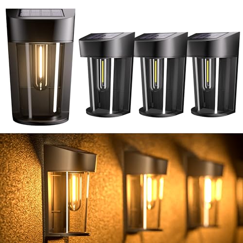 Quntis Solar Fence Lights, 4 Pack Solar Wall Lights Outdoor Garden, Waterproof Decorative Light, Auto ON/Off Retro Garden Fence Lights for Outside, Deck, Patio, Steps, Yard, Pathway, Warm White