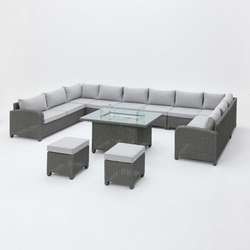 U-Shape Garden Furniture Set, U-Shape Rattan Garden Sofa with Fire Pit Table/Rising Table, Luxury Rattan Garden Furniture, Outdoor U-Shape Garden Set with Cushions (Fire Pit Table, 10 Seater Sofa)