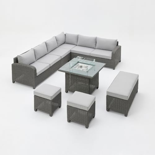 Rattan Garden Furniture with Fire Pit Table - Premium Series - 9 Seater Outdoor Furniture Rattan Corner Sofa Corner Garden Dining Sets - FREE RAIN COVER (Grey, Left Hand - Firepit Table)