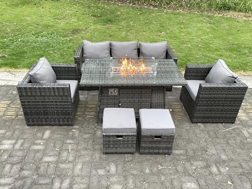 FMSGarden Outdoor Rattan Garden Furniture Gas Fire Pit Dining Table Gas Heater Sets Lounge Chairs Small Footstools Dark Mixed Grey 9 Seater