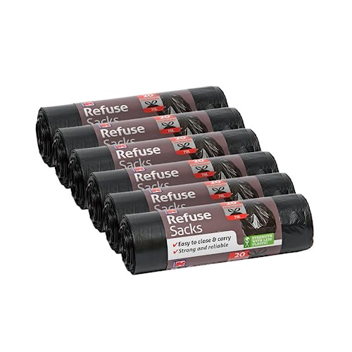 Kordis Heavy Duty Tie Handle Refuse Sacks - 6 x 20 Bags. 70L Strong, Plastic Black Bin Bags For Kitchen & Garden Bins. 120 Unscented Garbage Bags - 73.5 x 105cm