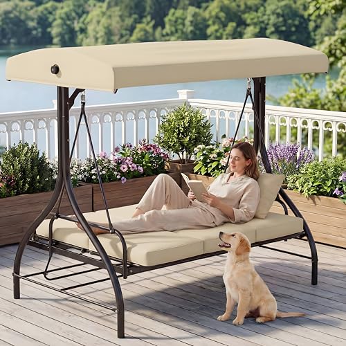 TLSUNNY 3 Seater Garden Swing, Convertible Glider Bed with Adjustable Canopy & Backrest, Heavy Duty Waterproof Outdoor Patio Swings Bench w/Removable Cushion for Backyard, Poolside, Balcony, Beige
