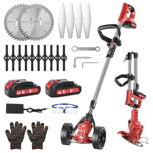 Ykall Cordless Electric Weed Wacker – Lightweight Battery-Powered Grass Trimmer with 3 Blade Types, 2 Batteries & Wheels – Foldable Lawn Edger & Brush Cutter for Garden & Yard