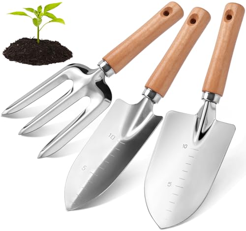 Garden Tool Set with Wood Handle, Aluminum Graduated Shovel, Hand Fork, Transplant Shovel with Scale, 3Pcs Heavy Duty Hand Tools Set for Garden Planting