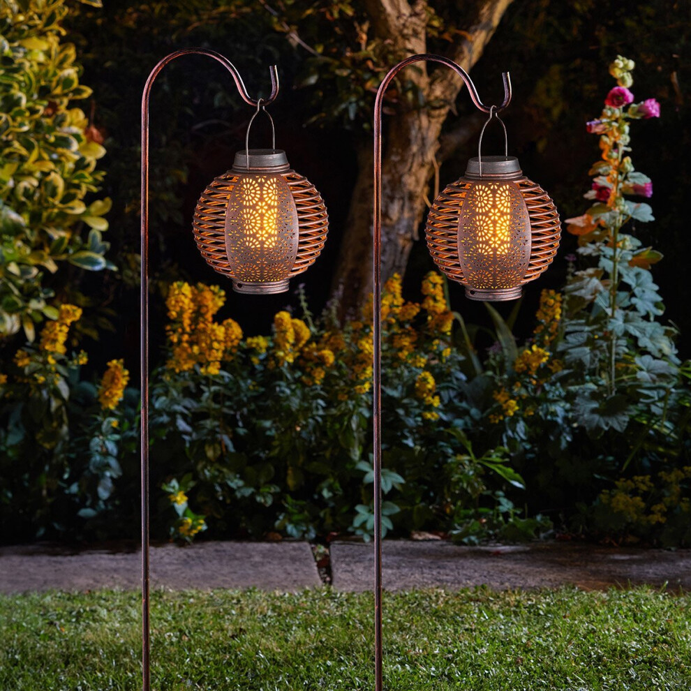 2 Pack Solar Power LED Realistic Flame Lantern Stake Lights | Hanging Garden Pathway Shepherd's Crook