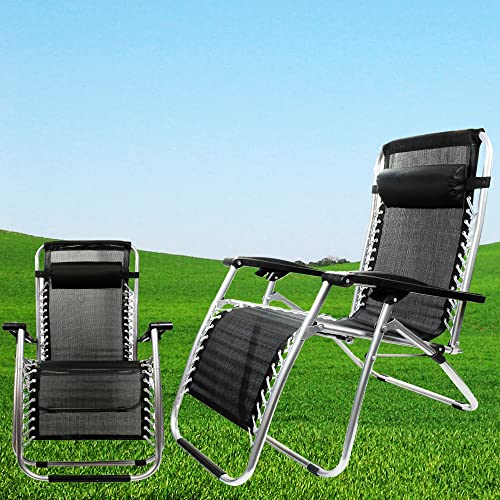 VIROSA Set of 2 Black | Zero gravity chair | Reclining & Folding Outdoor Garden Loungers | Made with Heavy Duty Textoline | Folding Chair with Cup Holder and Headrest Pillow (Black)