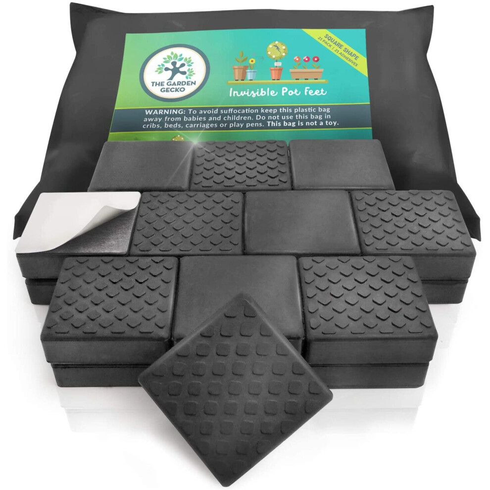The Garden Gecko Invisible Pot feet for outdoor plant pots and flowers, solid rubber risers with a custom non-slip square surface grip | 21 POT FOOT + 21 STRONG ADHESIVE PADS.