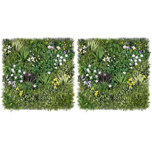 LUWENER Artificial Plant Living Wall Panels,1m x 0.5m Grass Plant Wall Panel Greenery Privacy Living Wall Fence Screening Home Garden Backdrop for Indoor Outdoor Home(2pcs,50 * 50cm with flower)