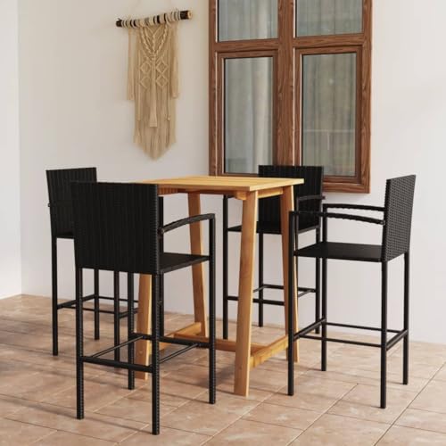YuuSsea 5-Piece Garden Bar Set, Black, Acacia Wood Table & PE Rattan Bar Stool, Weatherproof Outdoor Patio Furniture Set for Balcony, Patio, Garden, 4 Seats