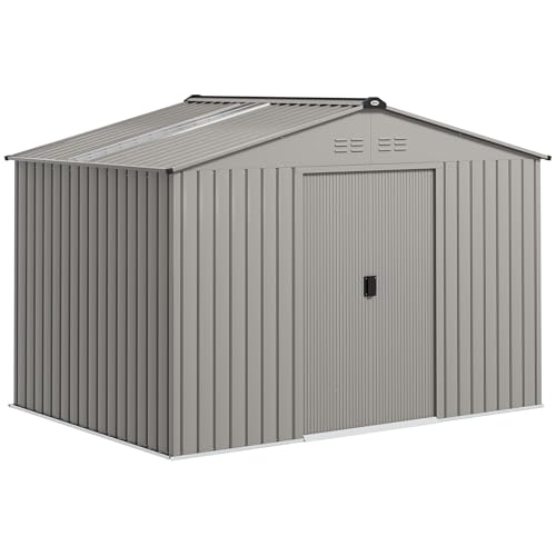 Outsunny 9 x 6ft Metal Garden Shed, Outdoor Storage Tool House with Ventilation Slots, Foundation Kit and Lockable Double Doors, Grey