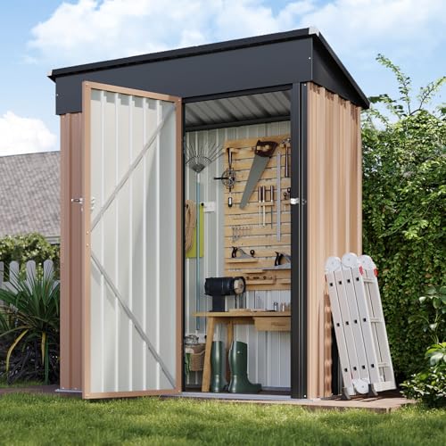 Aoxun 5x3ft Metal Garden Shed, Sheds and Outdoor Storage, Galvanized Waterproof Strong Reinforced Roof, with Lockable Doors & Slooping Roof for Backyard, Patio, Brown