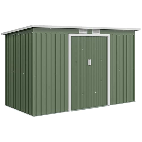 Outsunny 11.3 x 9.2ft Lean to Metal Garden Shed, Outdoor Galvanised Tool Storage House with Double Sliding Doors and 2 Air Vents, Green