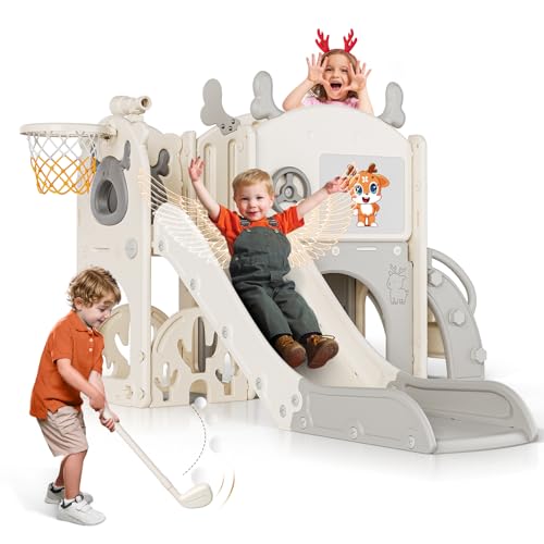 8 in1 Upgraded Toddler Slide Set, Kids Baby Slide with climbing bridge, golf set, Basketball Hoop ECT, Easy assembly, Infant and Toddler Garden Slide, indoor/outdoor (8-in-1-elk-beige)