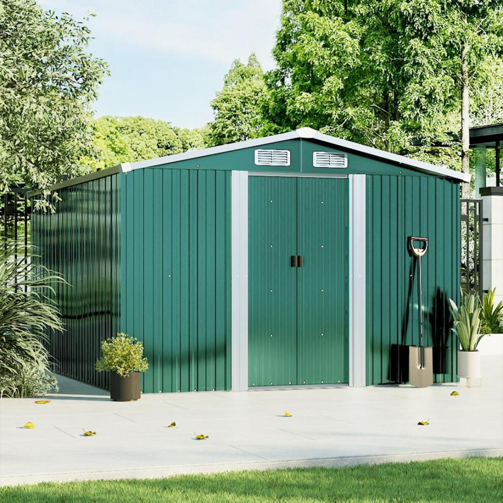 Garden Sanctuary 10.2x8.4ft Apex Roof Metal Garden Shed w Sliding door& Vents, Green