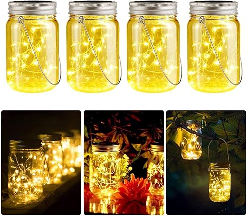 UOUNE Solar Garden Hanging Lanterns 4 Pack,Solar Powered Mason Jar Lights 20 LEDs Waterproof,Fairy String Glass Lights Indoor Outdoor for Tabletop Patio Courtyard Wedding Party Christmas(Warm White)