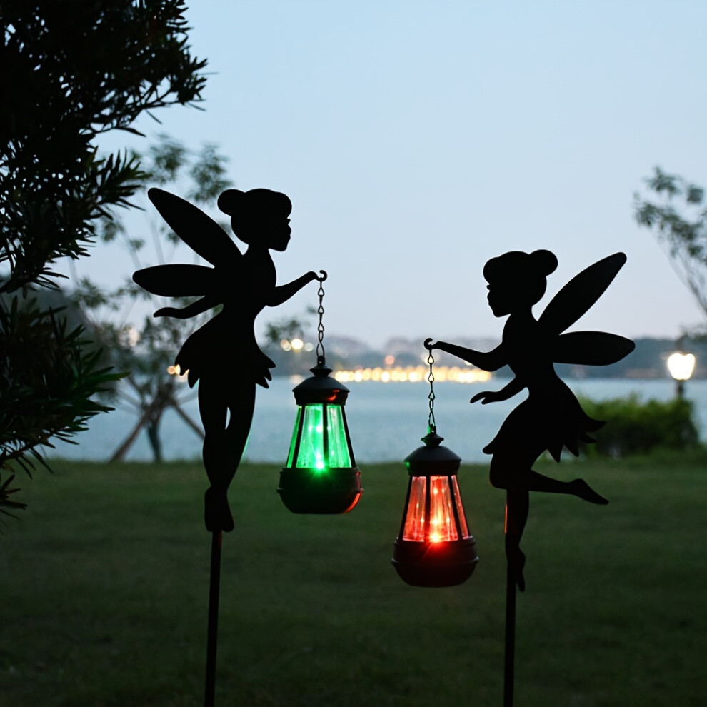 (Metal) 2pcs Solar Fairy Garden Stakes, Metal Silhouette Path Lights with Colorful LED Lanterns, Solar Powered Waterproof IPX4 Lawn Lamps, Push Button