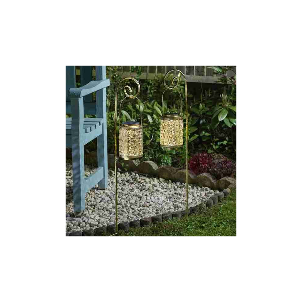 2 x Metal Moroccan Solar Powered Garden Brushed Gold Lanterns & Crooks
