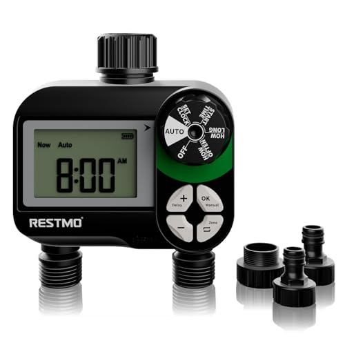RESTMO Water Timer 2 Outlets, Irrigation Hose Timer with Rain Delay/Manual/Automatic Watering System for Outdoor Faucet, Garden Sprinkler, Yard and Lawn