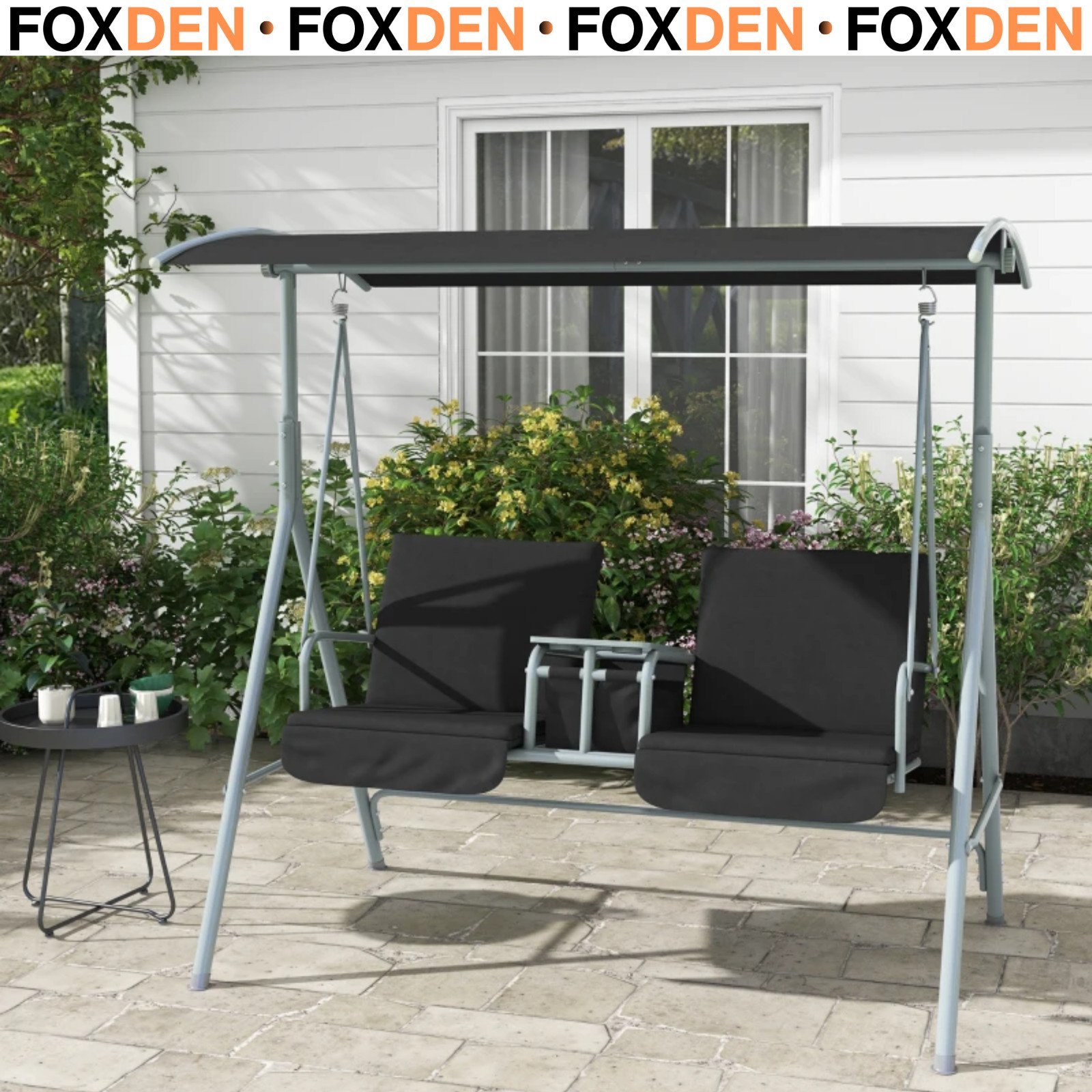 2 Seater Garden Swing Chair with Tilting Canopy Padded Seats Storage Tray & Bag