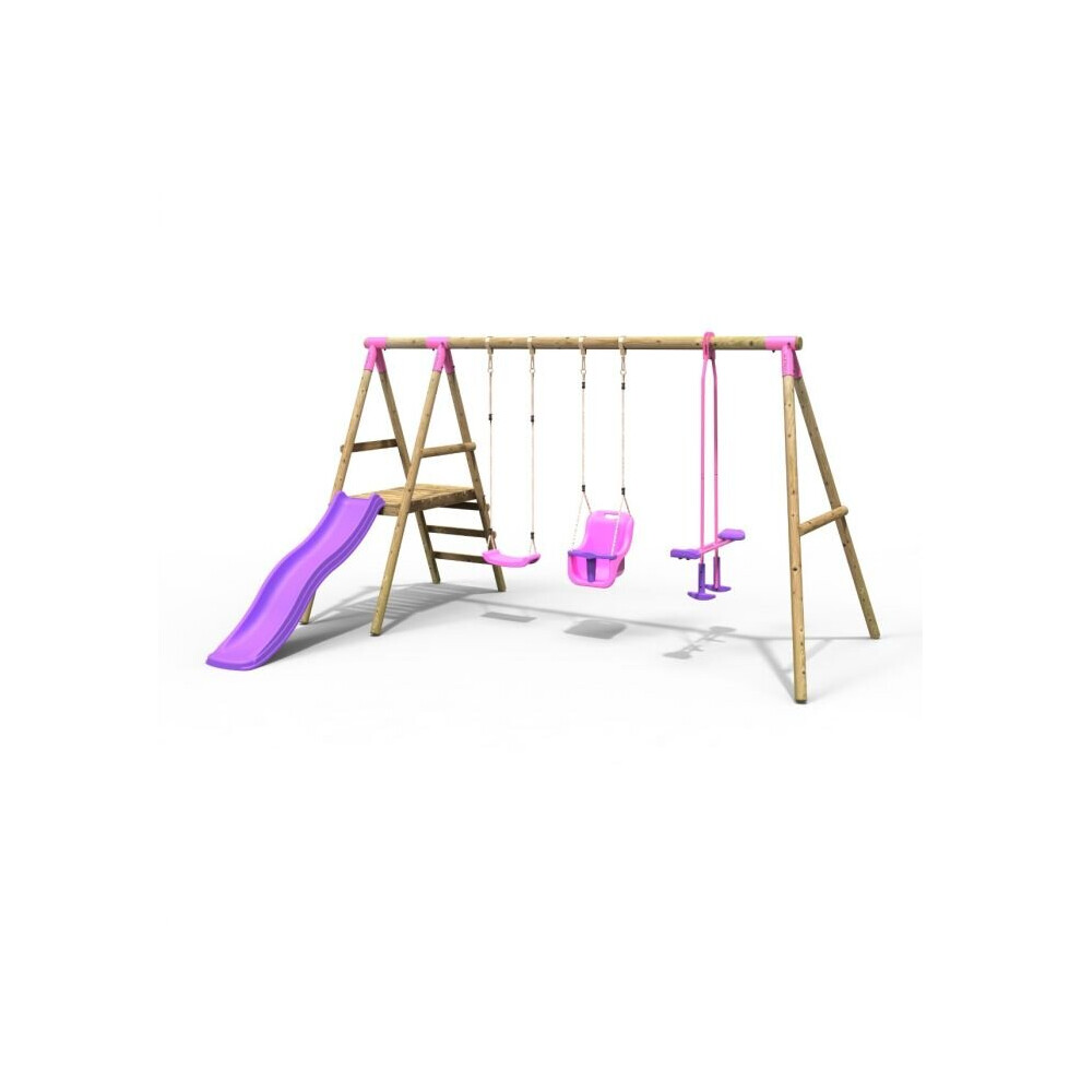 Rebo Adventure Wooden Garden Climbing Frame, Swing Set and Slide for Kids - Rainier Pink