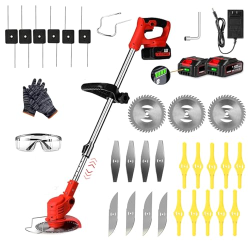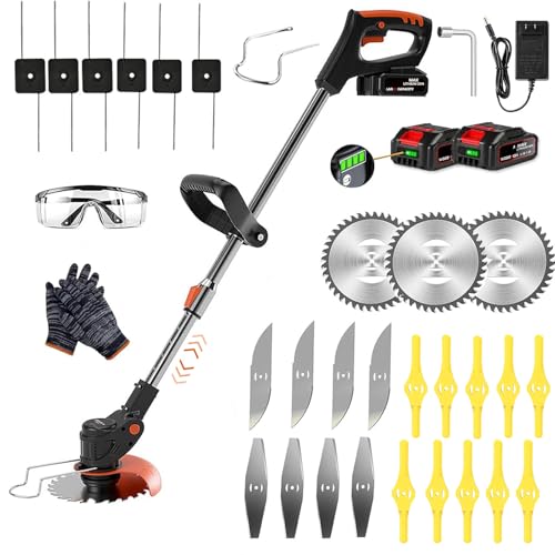 Cordless Strimmer With 2 Battery And Charger - 21V Telescopic Lightweight Grass Trimmer Battery Grass Trimmer With 10 x Metal Blades & 2x Circular Saw Blade, 24cm Cutting Width Garden Lawn Trimmer