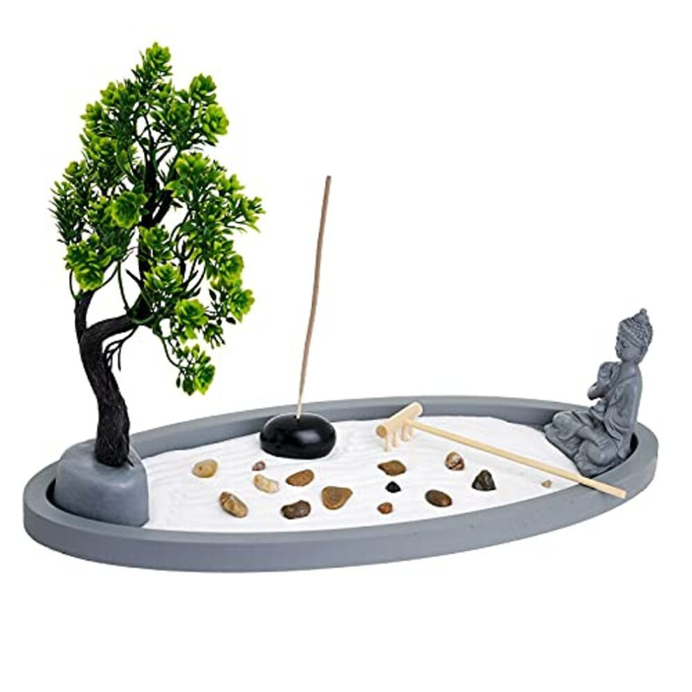 London Boutique Zen Garden Thai Buddha - Incense Holder - White Sand - Decorative Stones - Wooden Shovel - Oval Base