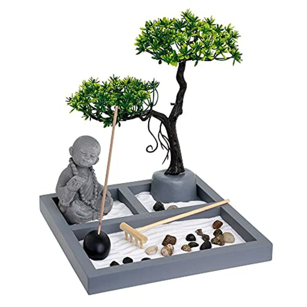 London Boutique Zen Garden Little Buddha - Incense Holder - White Sand - Decorative Stones - Wooden Shovel - Rectangular Base