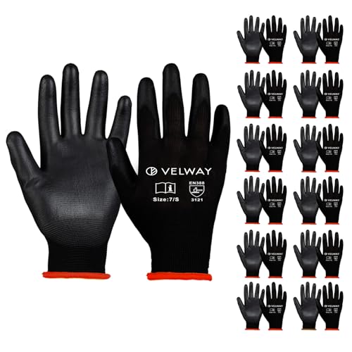 Velway Safety Work Gloves - 12 Pairs Non-Slip PU Coated Gardening & Mechanic Gloves for Men & Women (Black, Size 7/S)