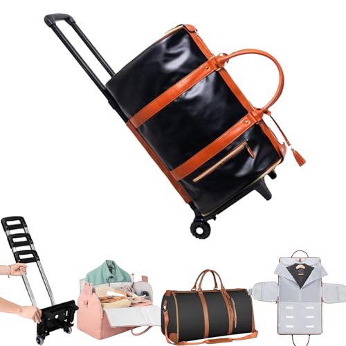 Asixxsix Rolling Garment Bags for Travel, 40L Rolling Duffel Bag with Detachable Trolley, PU Leather Water Proof Travel Luggage Bag Suitcase for Men Women Business (Black Brown)