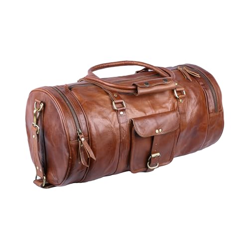 Urban Leather 20 inch Genuine Leather Gym Sports Bag for Men Women Handmade Round Travel Duffel Carry-On Garment Bag Large Luggage Weekender Overnight Brown Duffle Bags