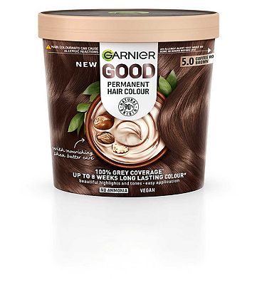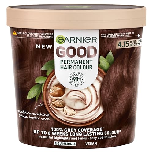Garnier GOOD Permanent Hair Dye, 4.15 Iced Chestnut Brown. Delivers 100% grey coverage and 8-week colour. No ammonia, vegan shea butter formula for cool, rich brown on all hair types.