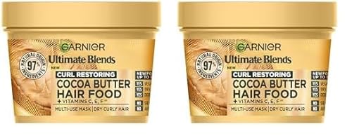 Garnier Hair Mask for Dry, Curly Hair | Cocoa Butter Hair Food by Garnier Ultimate Blends, 3-in-1: Pre Shampoo, Conditioner |97% Natural Origin | 100% Vegan Formula* 390 ml (Pack of 2)