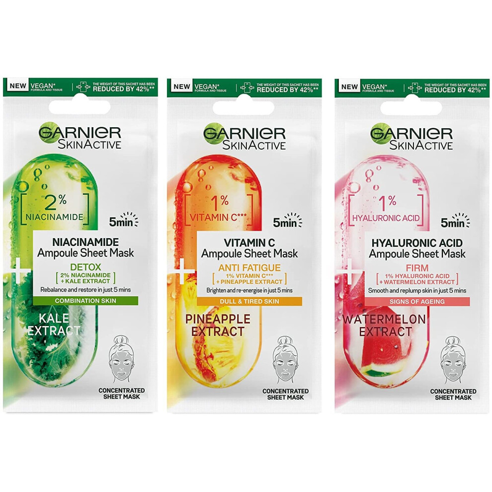 Garnier Ampoule Sheet Masks Set Of 3, Pineapple & 1% Vitamin C To Brighten, Watermelon & 1% Hyaluronic Acid To Replump, Kale & 2% Niacinamide To