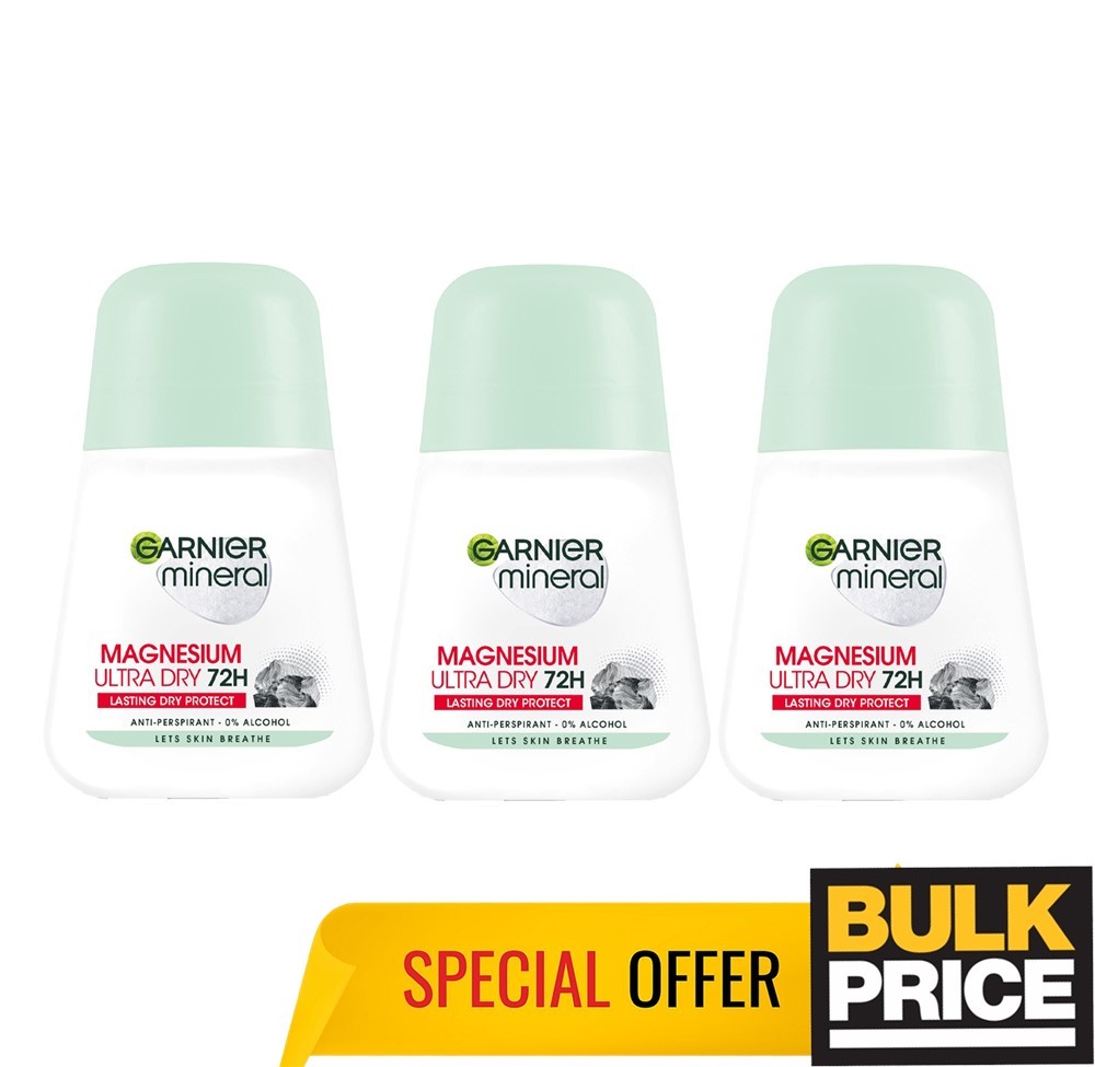 Garnier Mineral Magnesium Ultra Dry Deodorant Roll-On 72H Sweat Protect 3-Pack