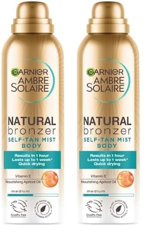 Garnier Ambre Solaire Natural Bronzer Quick Drying Body Self Tan Mist, Medium, Intense & Streak Free Fake Tan, Lasts Up to 1 week, Approved by Curelty Free International, Vegan Formula, 150ml