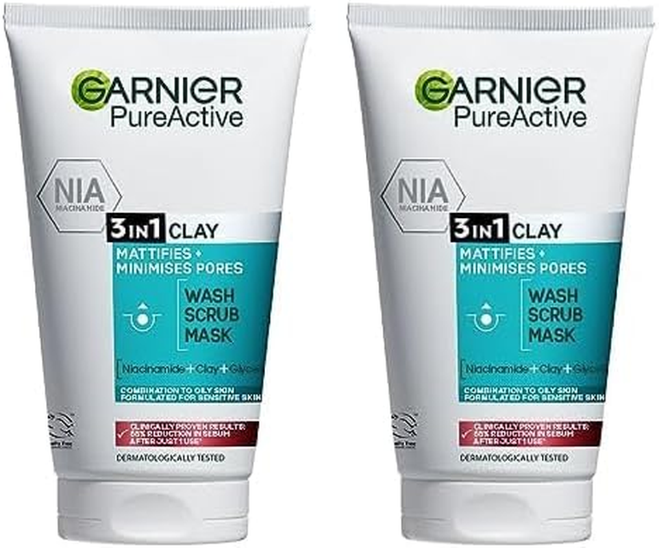 3x Garnier Pure Active 3 in 1 Clay Face Wash Scrub Mask 150ml with Niacinamide