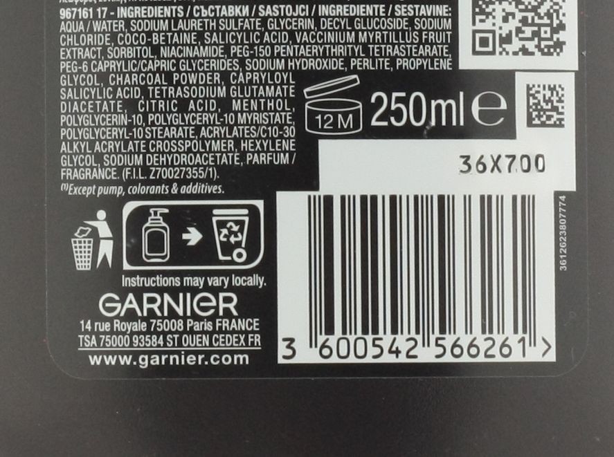 Garnier Pure Active Charcoal Cleansing Gel Anti Blackhead 250ml - FREE SHIPPING