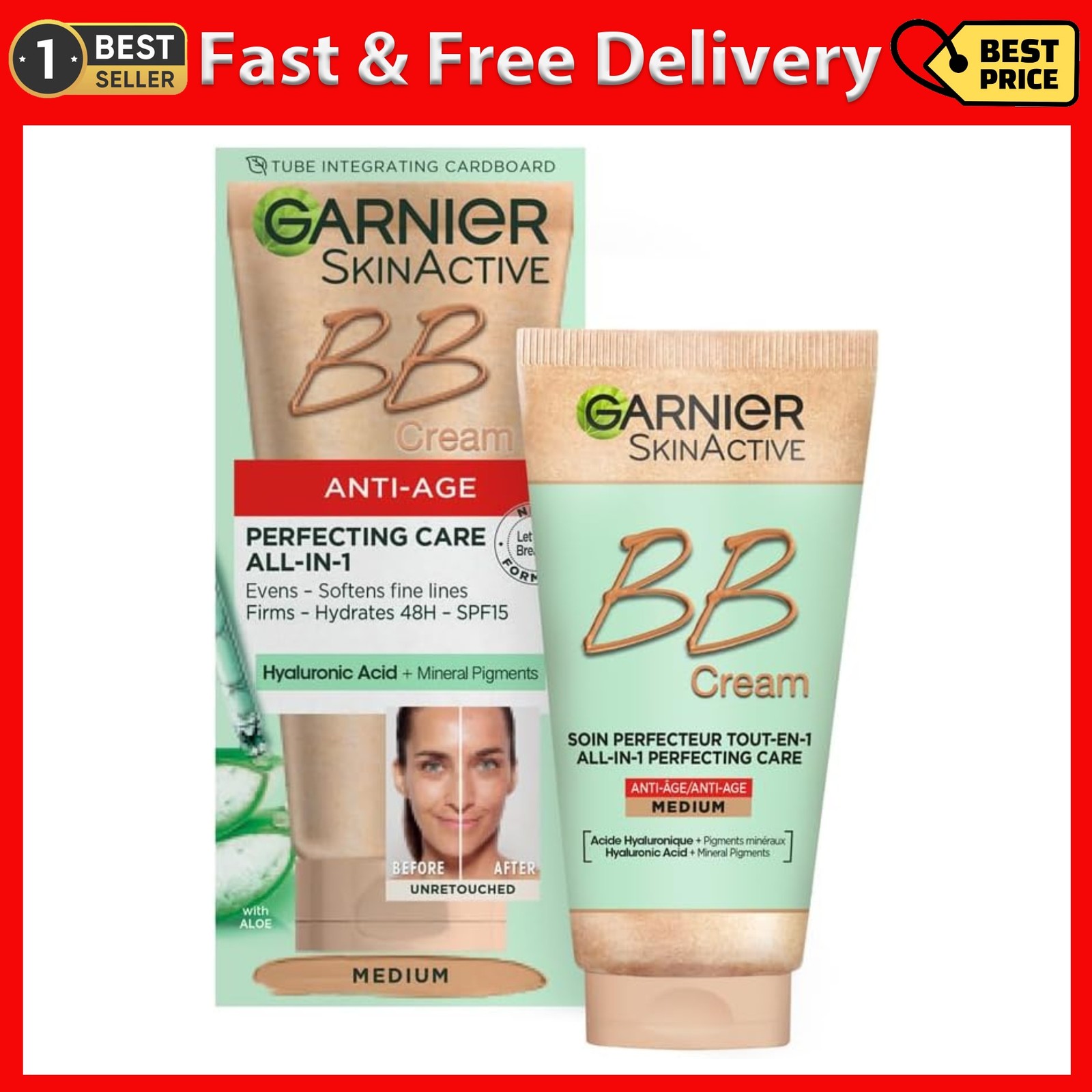 Garnier SkinActive Anti-Age BB Cream, Shade Medium, Tinted Moisturiser SPF 15, Softens Fine Lines & Firms Skin, With Hyaluronic Acid, Aloe & Mineral Pigments, 50 m