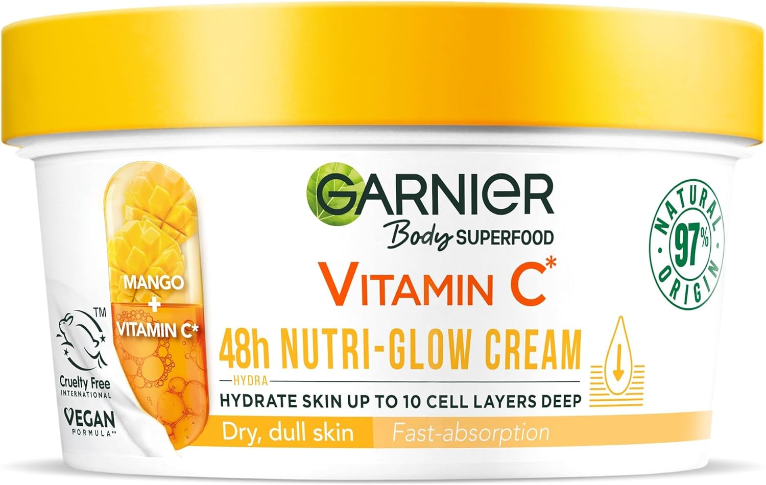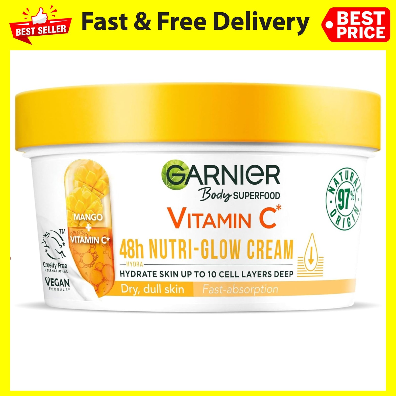 Garnier Body Superfood, Nutri Glow Cream, Vitamin C & Mango, for Dry Dull Skin, Brightening Glowing, Nourishing Fast Absorbing, Vegan Formula,